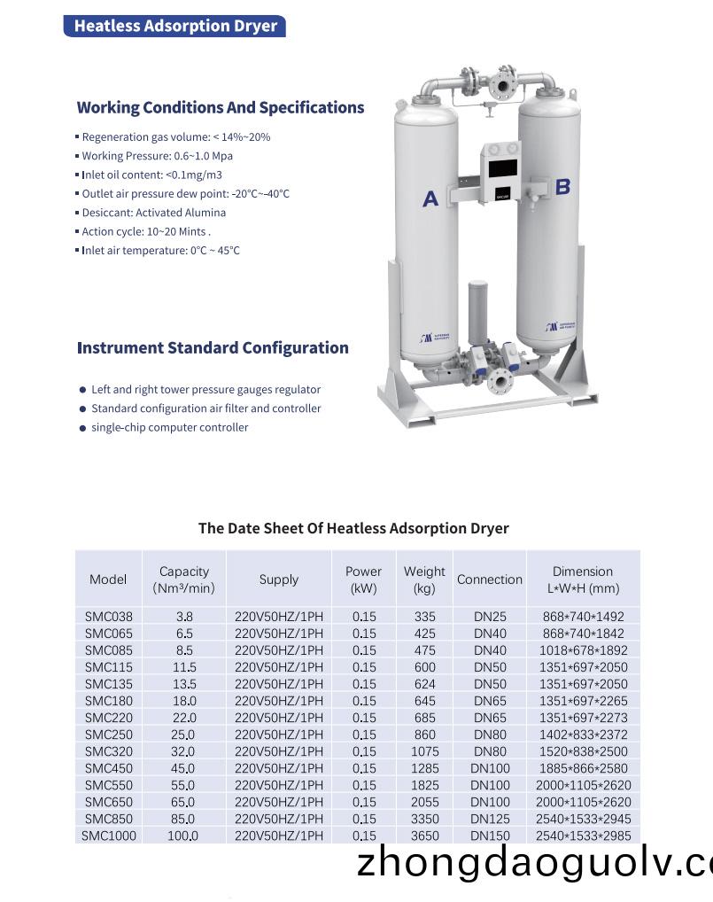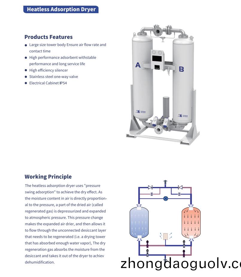 The heatless adsorption dryer uses "pressureswing adsorption"to achieve the dry effect.Asthe moisture content in air is directly proportion-al to the pressure,a part of the dried air (calledregenerated gas)is depressurized and expandedto atmospheric pressure.This pressure changemakes the expanded air drier,and then allows itto flow through the unconnected desiccant layerthat needs to be regenerated (i.e.a drying towerthat has absorbed enough water vapor),The dryregeneration gas absorbs the moisture from thedesiccant and takes it out of the dryer to achiev