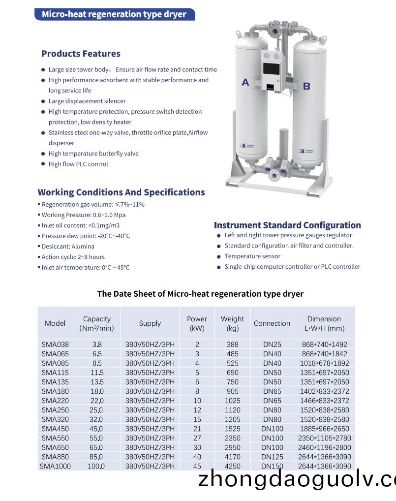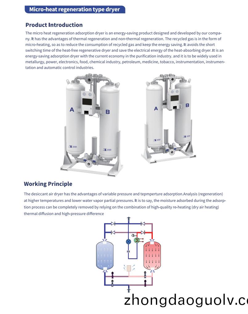 The micro heat regeneration adsorption dryer is an energy-saving product designed and developed by our compa-ny.It has the advantages of thermal regeneration and non-thermal regeneration.The recycled gas is in the form ofmicro-heating,so as to reduce the consumption of recycled gas and keep the energy saving.It avoids the shortswitching time of the heat-free regenerative dryer and save the electrical energy of the heat-absorbing dryer.It is anenergy-saving adsorption dryer with the current economy in the purification industry.and it is to be widely used inmetallurgy,power,electronics,food,chemical industry,petroleum,medicine,tobacco,instrumentation,instrumen-tation and automatic control industries.